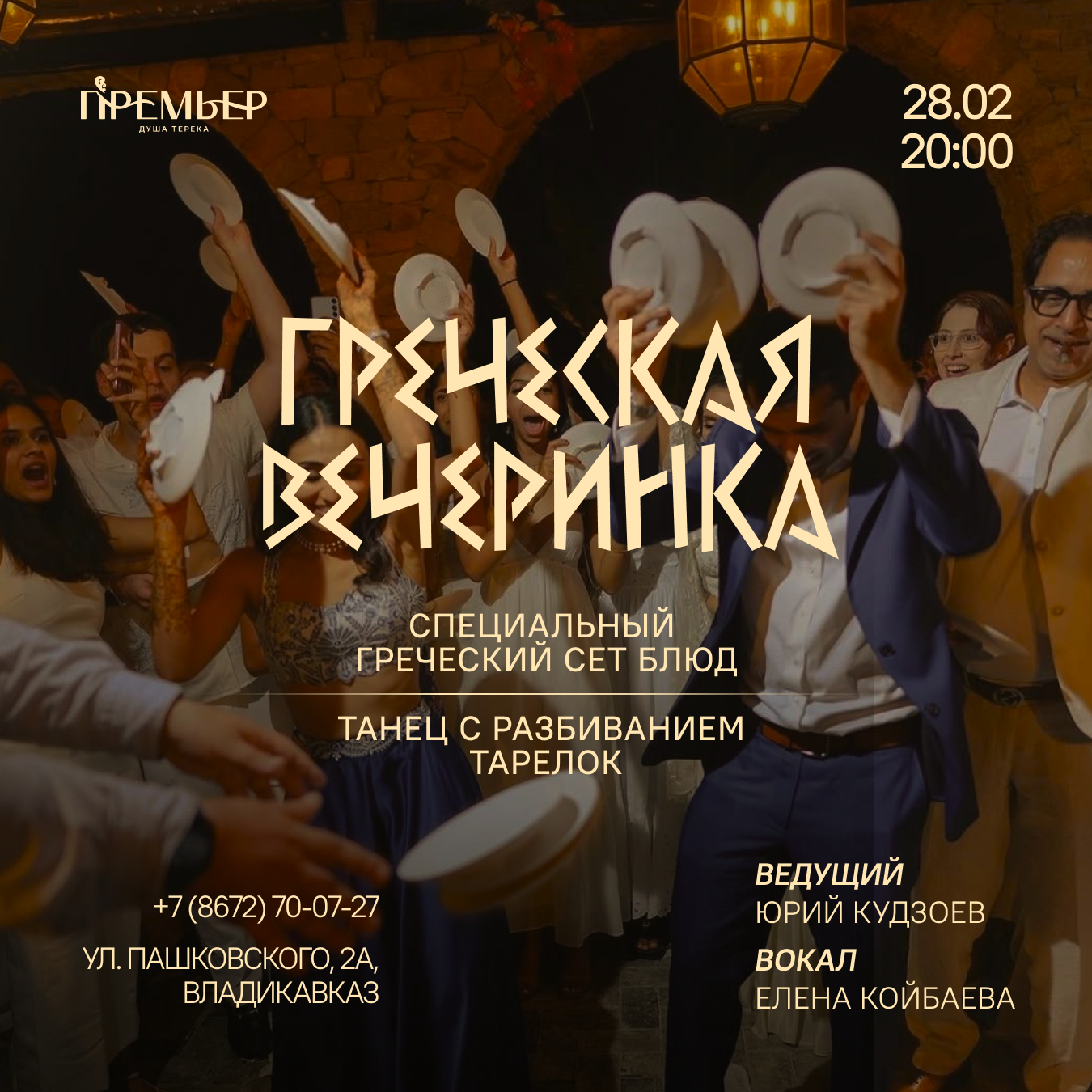 Приглашаем вас провести вечер в атмосфере настоящего греческого праздника. 28 февраля в 20:00 ресторан Premier превращается в место ярких эмоций, музыки и традиций Средиземноморья.
